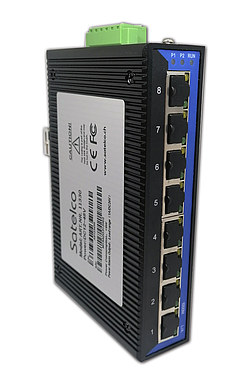 Der Satelco 8-Port Gigabit Ethernet Switch ist speziell für Anwendungen der Automatisierungssteuerung konzipiert. Er ist mit acht 10/1000 Base-TX RJ-45-Ports ausgestattet. Er unterstützt eine redundante Spannungsversorgung, verfügt über ein Metallgehäuse der Schutzart IP40 und sorgt so für schnelle und zuverlässige Datenübertragung im rauen industriellen Umfeld.