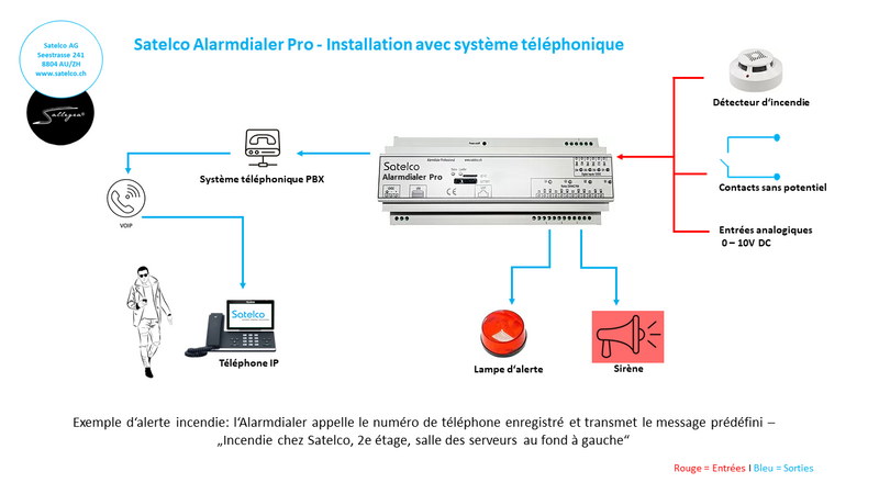 Une installation avec un système téléphonique sert de système d'alarme simple qui peut gérer jusqu'à 20 entrées d'alarme numériques et 16 entrées d'alarme analogiques. Il est possible de prédéfinir des annonces et des textes pour chaque alarme. En outre, il est possible d'effectuer des actions via les 4 relais intégrés, comme par exemple l'activation d'une sirène ou d'une lampe d'alarme.