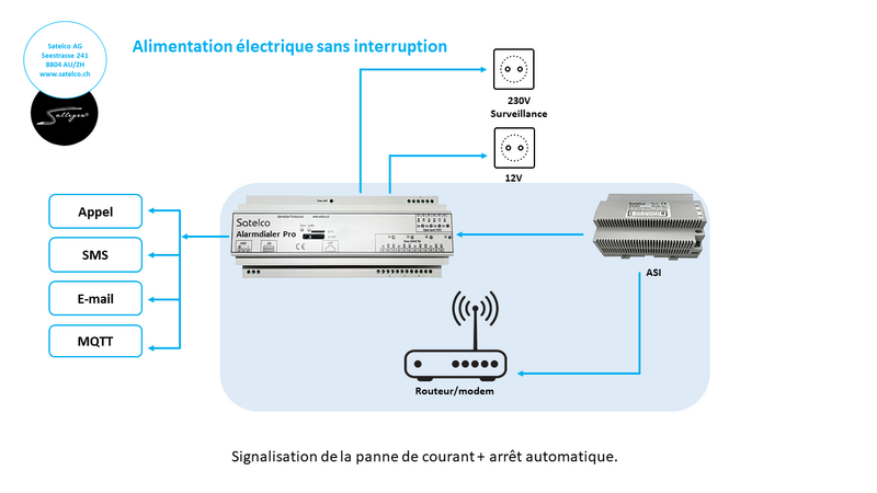 Sert à garantir l’alimentation en électricité des appareils électriques critiques en cas de perturbations dans le réseau électrique, telles que les coupures de courant de courte durée et le fluctuations de courant sous forme de surtensions et de sous-tensions. Soutenez le Satelco Alarmdialer avec l’ASI et signalez les coupures de courant et de tension.