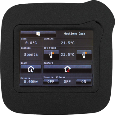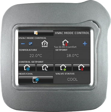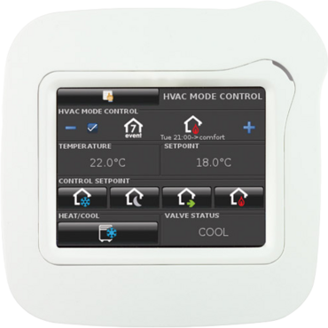 Das Eelecta-Touchpanel-Display: leistungsfähige Steuerung in unverwechselbarer Form. Mit dem Farbdisplay können Dimmung, Status, Werte, Beleuchtung, Jalousien und Schaltuhren gesteuert und kann nach Bedarf passwortgeschützt werden. Mit dem eingebauten Temperatursensor werden Uhr- oder Chrono- oder Fancoil-Steuerfunktionen gesteuert. DMX farbige LED oder Lampen werden über das optionale DMX Gateway gesteuert, die Laststeuerung mit automatischer Lastab-schaltung erfolgt über den optionalen Leistungsmesser. Aufgebaut auf Linux® OS und ETS- programmierbar, ist das 3,5” Touch Panel mit einer LED-Anzeige und einem Summer für Alarm-Funktionen ausgestattet.